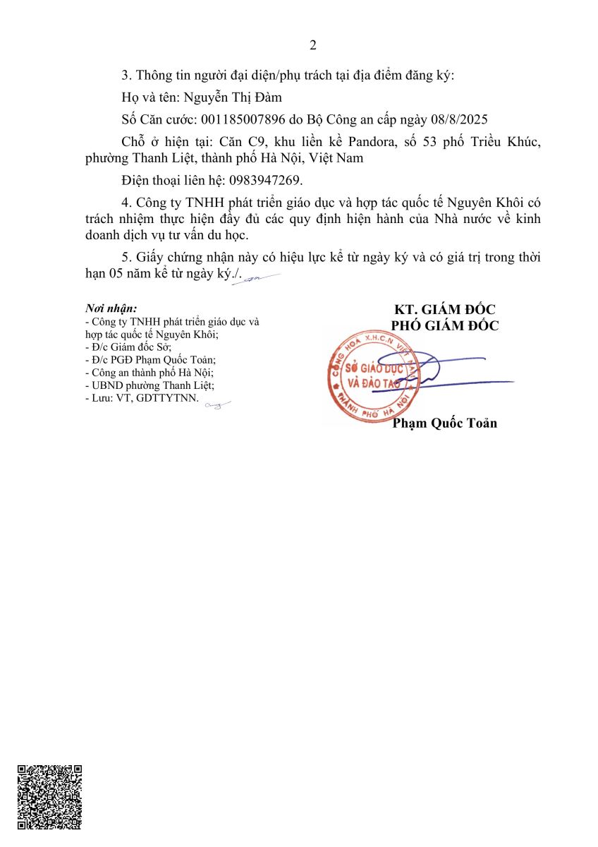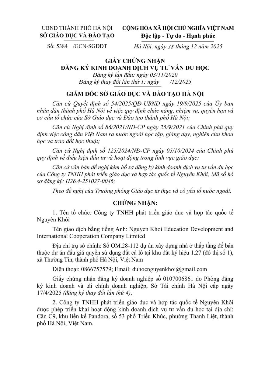 NGUYÊN KHÔI EDU trân trọng thông báo: Năm 2025, Trung tâm tiếp tục được cơ quan có thẩm quyền cấp lại Giấy chứng nhận đăng ký kinh doanh dịch vụ tư vấn du học, theo đúng quy định của pháp luật hiện hành.